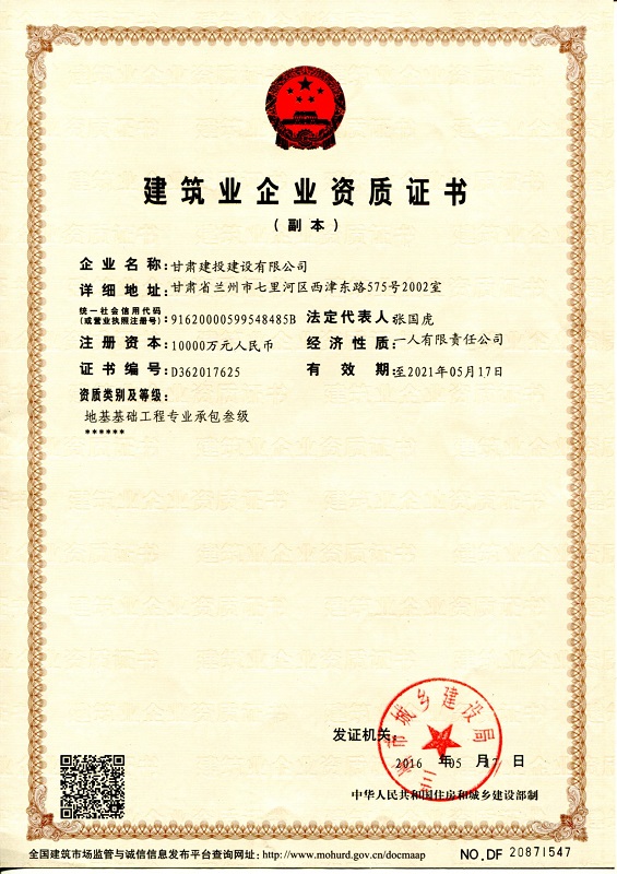 2016年以來,建設(shè)公司成功取得建筑工程施工總承包和建筑裝修裝飾工程專業(yè)承包兩項(xiàng)一級資質(zhì),消防設(shè)施工程專業(yè)承包二級資質(zhì)。目前,公司還具有市政公用工程施工總承包、鋼結(jié)構(gòu)工程專業(yè)承包和建筑機(jī)電安裝工程專業(yè)承包三項(xiàng)二級資質(zhì);地基基礎(chǔ)工程專業(yè)承包一項(xiàng)三級資質(zhì)。