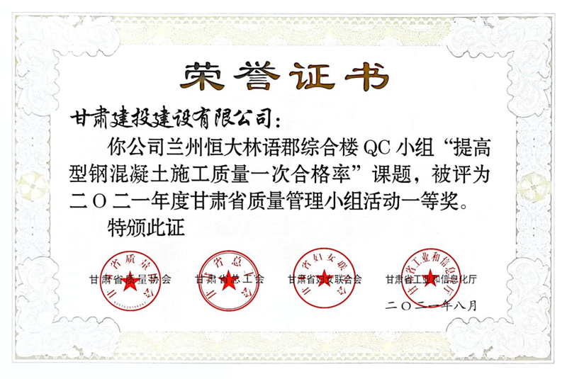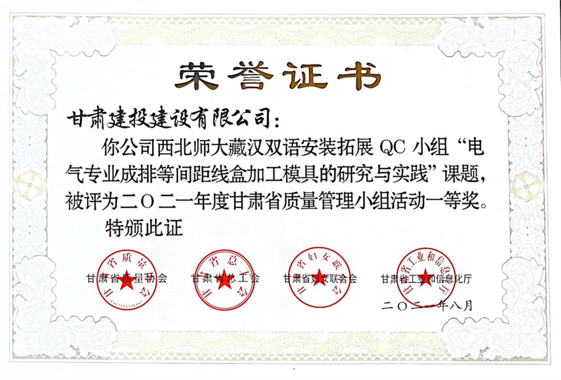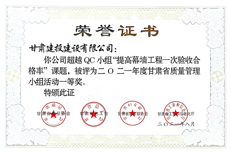 建設(shè)公司申報的36項QC成果中,1項成果獲全國“工程建設(shè)質(zhì)量管理小組二類成果,1項成果獲“甘肅省質(zhì)量管理小組活動最高榮譽獎——特等獎”、14項成果獲一等獎、19項成果獲得二等獎、2項成果獲得三等獎。建設(shè)公司榮獲“2021年度甘肅省質(zhì)量管理小組活動優(yōu)秀企業(yè)”稱號,這是繼2019年后,公司連續(xù)三年獲此殊榮。