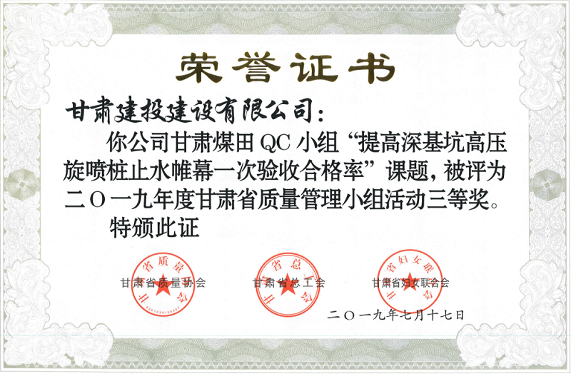 本工程獲得2020年度甘肅省建設(shè)工程文明工地,2020年度天水市文明工地,發(fā)表相關(guān)論文2篇(高壓旋噴樁止水帷幕在工程中的具體應(yīng)用、輪扣式支模架施工技術(shù)的應(yīng)用),獲甘肅省質(zhì)量協(xié)會(huì)QC活動(dòng)成果3項(xiàng),專利一項(xiàng)。