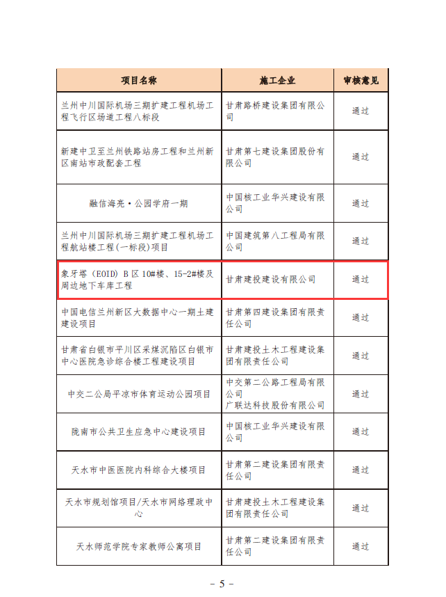 獲得“2021年甘肅省建設(shè)建設(shè)工程文明工地”的項(xiàng)目分別為:建設(shè)一公司承建的甘肅省軍糧庫(kù)綜合保障基地一期項(xiàng)目二標(biāo)段、百酈天香項(xiàng)目四標(biāo)段;建設(shè)三公司承建的象牙塔(EOID)B區(qū)10#樓、15-2#樓及周邊地下車庫(kù)工程、渭源縣城北環(huán)路東段棚戶區(qū)改造項(xiàng)目S2區(qū)5#-10#樓建設(shè)工程;建設(shè)四公司承建的定西市安定區(qū)關(guān)川中學(xué)建設(shè)項(xiàng)目;建設(shè)五公司承建的環(huán)縣北區(qū)公共租賃住房建設(shè)項(xiàng)目(一標(biāo)段);建設(shè)六公司承建的蘭州·桃李春風(fēng)康養(yǎng)小鎮(zhèn)(一期)項(xiàng)目、天水市麥積區(qū)上尚宅二期(一標(biāo)段);建設(shè)八公司承建的臨夏市肖家棚戶區(qū)改造安置小區(qū)C區(qū)建設(shè)項(xiàng)目施工二標(biāo)段;建設(shè)九公司承建的蘭州環(huán)球中心1#、6#、7#、8#、9#、10-2#樓、供熱站、小區(qū)大堂及二期地下室項(xiàng)目,天水市圖書(shū)館新館建設(shè)項(xiàng)目,天水市文化館新館建設(shè)項(xiàng)目。