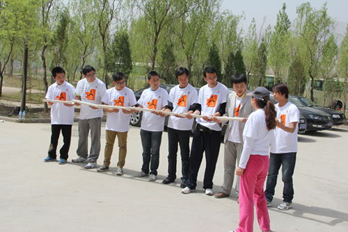 在教練簡短的介紹之后,便開始了讓大家好奇和期待的訓(xùn)練。為保證活動(dòng)的安全進(jìn)行,此次活動(dòng)的所有項(xiàng)目均在教練的指導(dǎo)下在地面有序開展?;顒?dòng)項(xiàng)目包括高空斷橋、背摔,動(dòng)感顛球,珠行萬里,多人跳繩等活動(dòng)。其中,“高空斷橋”時(shí)每位成員都必須戰(zhàn)勝自我,在同伴的鼓舞、指引下釋放潛能;“背摔”告訴大家建立換位思考的意識(shí),站在對方的角度思考問題,架起相互之間理解的橋梁。這一個(gè)個(gè)充滿趣味的活動(dòng),就像戰(zhàn)場后勤供給的模擬比賽,中間盡管出現(xiàn)了各種或令人捧腹,或令人急躁的麻煩,但結(jié)果卻讓大家很感動(dòng),很滿足??粗蠹夷樕纤烈饬魈实男θ莺秃顾蠹叶颊鎸?shí)地感受到自己身在這樣一個(gè)集體是多么幸福的一件事。