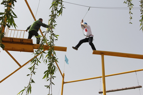 表彰大會(huì)結(jié)束后,素質(zhì)拓展訓(xùn)練活動(dòng)正式啟動(dòng)“開營”儀式。初到訓(xùn)練場地,頓覺天朗氣清,清晨的濃霧還游離在濃綠色的山上,風(fēng)過便是一陣涼爽。團(tuán)員們在這樣的環(huán)境下對訓(xùn)練也頗增了幾分信心。開班前,教練讓大家進(jìn)行了“愛的鼓勵(lì)”等一系列的歡快活動(dòng),旨在打破人與人之間的隔閡,建立相互信任的基礎(chǔ),營造團(tuán)隊(duì)快樂和諧的氛圍。