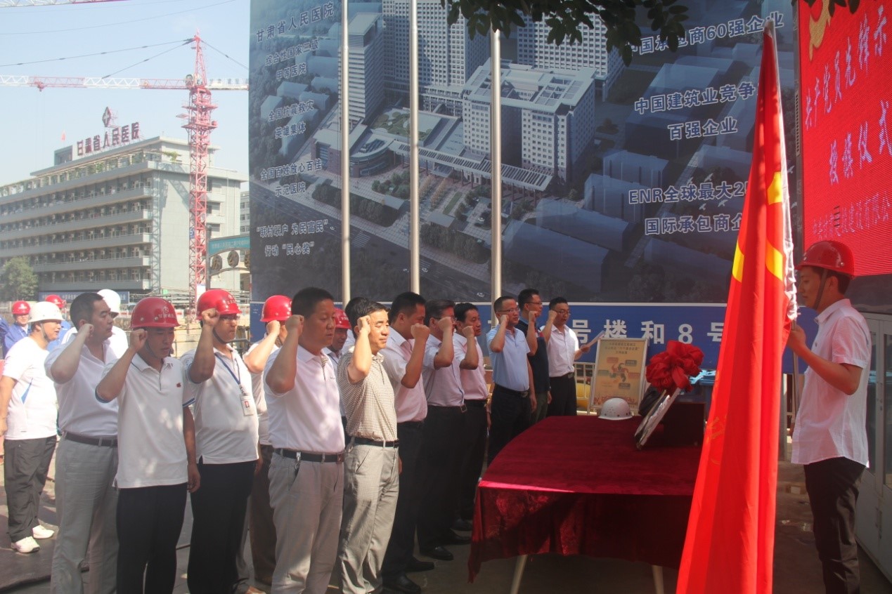 8月5日,建設(shè)公司 “黨員先鋒示范工程”授旗儀式在省人民醫(yī)院住院部二期7#、8#項目部舉行。建設(shè)公司黨委書記張國虎為項目部授旗,項目部黨員代表楊鵬浩代表項目部接過“黨員先鋒示范工程”旗幟并帶領(lǐng)項目部全體黨員進行宣誓。