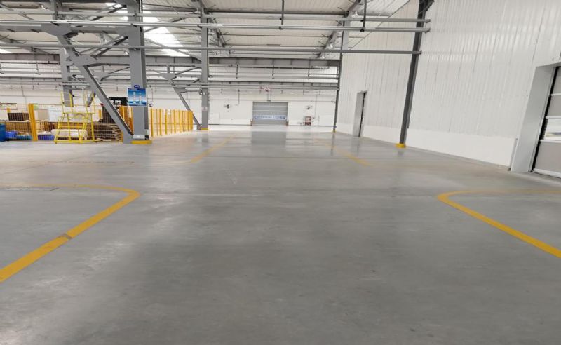 該工程中應(yīng)用了鋼纖維混凝土,通過在混凝土中摻入一定數(shù)量的鋼纖維,提高了混凝土的抗壓、抗拉、抗彎,抗裂及抗疲勞、韌性等性能。面層耐磨粉與混凝土整體凝固而成,其中摻入的骨料硬度極高,有效提高地坪的耐磨、抗沖擊、抗壓性能,延長了地坪使用壽命。