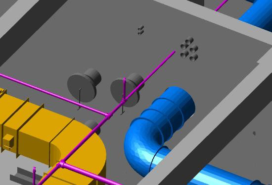 設備管道的綜合布置將所有管線通過BIM技術(shù)全部合成在一張圖上,找出復雜的交叉位置,發(fā)現(xiàn)各項專業(yè)在設計上存在的矛盾。根據(jù)各專業(yè)內(nèi)部的排布規(guī)則,不同專業(yè)相互間的排布規(guī)則,以及與結(jié)構(gòu)建筑的間距要求,維修空間等,具體規(guī)劃管線水平、垂直方向的分部。