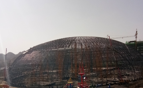 直屬項目部主要承建室內(nèi)水上樂園、溫泉度假酒店、會議中心及輔房四個單體,水上樂園室內(nèi)館工程是西部恐龍園水世界的核心地標(biāo)性建筑,是水世界的標(biāo)志性建筑,建筑形式為雙螺旋球網(wǎng)架,基礎(chǔ)形式為樁筏聯(lián)合,井樁共計473根,整體建筑為橢圓形建筑,其中長軸200米,短軸176米,網(wǎng)架中心建筑高度為40米,是目前西北最大的雙螺旋球網(wǎng)架結(jié)構(gòu)建筑。