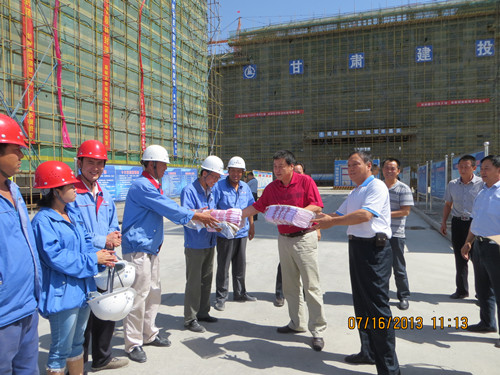 李董事長一到嘉峪關,顧不上一路行車的辛苦和疲累,立即趕到嘉峪關市酒鋼三中工地,一到工地,映入眼簾的是整潔的施工現(xiàn)場,封頂儀式留下的條幅依舊鮮艷奪目,綠色的密目網和黃色的腳手架相映成輝,工地上,李董事長首先對現(xiàn)場施工人員進行了慰問,發(fā)放了慰問品,并聽取了建設公司三公司領導的簡短匯報,饒有興致的查看了隔震墊施工的技術成果,并詳細了解了隔震墊的施工工藝,在樓層上,肯定了框架的施工質量,也提出了施工方面的不足與改進的地方,緊接著對建設公司三公司在嘉峪關所屬項目逐個進行了檢查指導。
