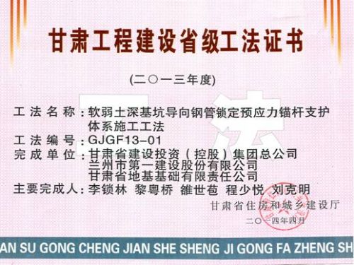 近日,由建設(shè)公司技術(shù)質(zhì)量部主編申報(bào)的《軟弱土深基坑導(dǎo)向鋼管鎖定預(yù)應(yīng)力錨桿支護(hù)體系施工工法》榮獲“2013年度甘肅工程建設(shè)省級工法”。