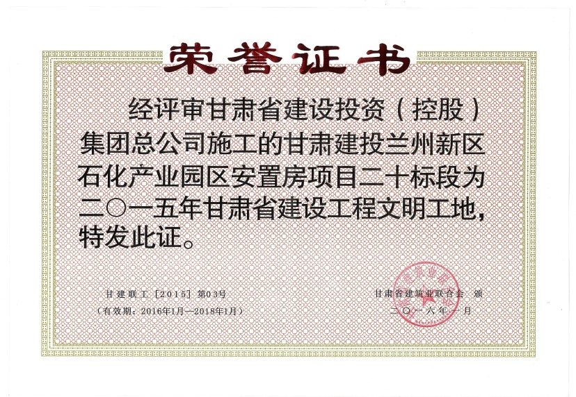 蘭州新區(qū)石化產(chǎn)業(yè)園區(qū)安置房項(xiàng)目二十標(biāo)段榮獲2015年省級文明工地