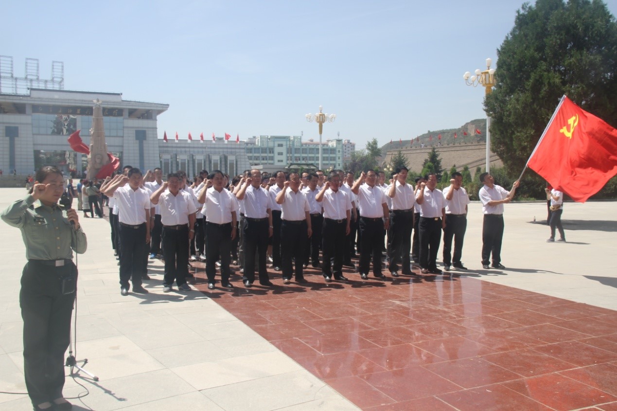 當天上午,參會人員來到紅軍長征會師之地會寧縣,在會師樓前向革命英烈敬獻花籃并鞠躬致敬,隨后新入黨的共產(chǎn)黨員與老黨員一起在會師樓下,重溫了入黨誓詞,聆聽了關于中國工農(nóng)紅軍一、二、四方面軍在會寧會師的相關歷史情況和關于紅軍長征精神的主題講解、參觀了紅軍長征會師紀念館。
