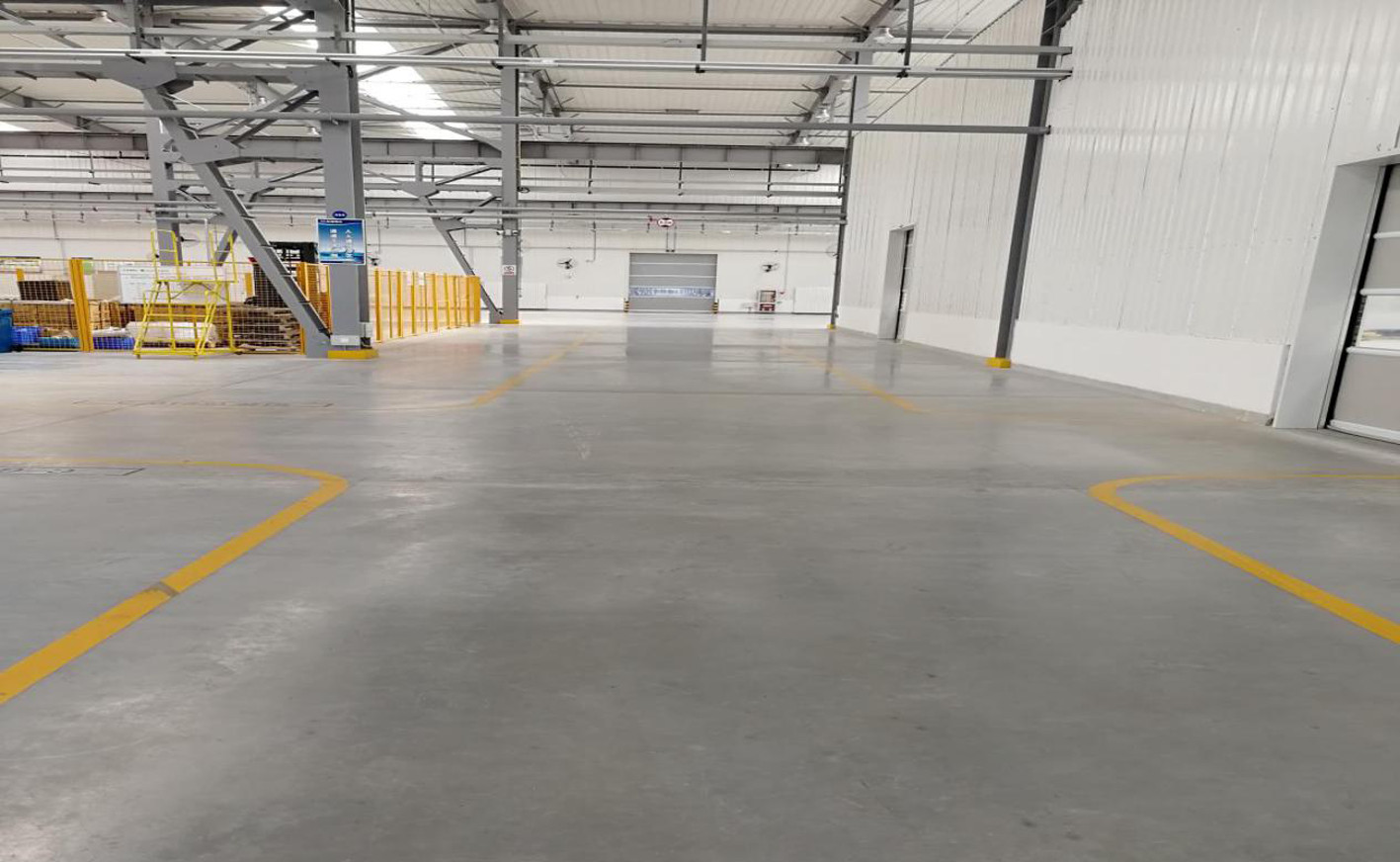 該工程中應(yīng)用了鋼纖維混凝土,通過在混凝土中摻入一定數(shù)量的鋼纖維,提高了混凝土的抗壓、抗拉、抗彎,抗裂及抗疲勞、韌性等性能。面層耐磨粉與混凝土整體凝固而成,其中摻入的骨料硬度極高,有效提高地坪的耐磨、抗沖擊、抗壓性能,延長了地坪使用壽命。